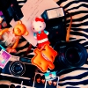 Description: Image: A collection of items, including two cameras, a Hello Kitty toy, and a handwritten note.